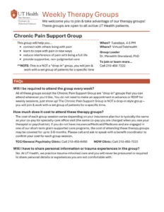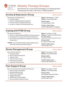 Each group has eligibility requirements for entry. Some are open to all UT Health clients, while others require screening. Some are offered online using encrypted video services, while others are held in person at the UT Health San Antonio Behavioral Health and Wellness Center.